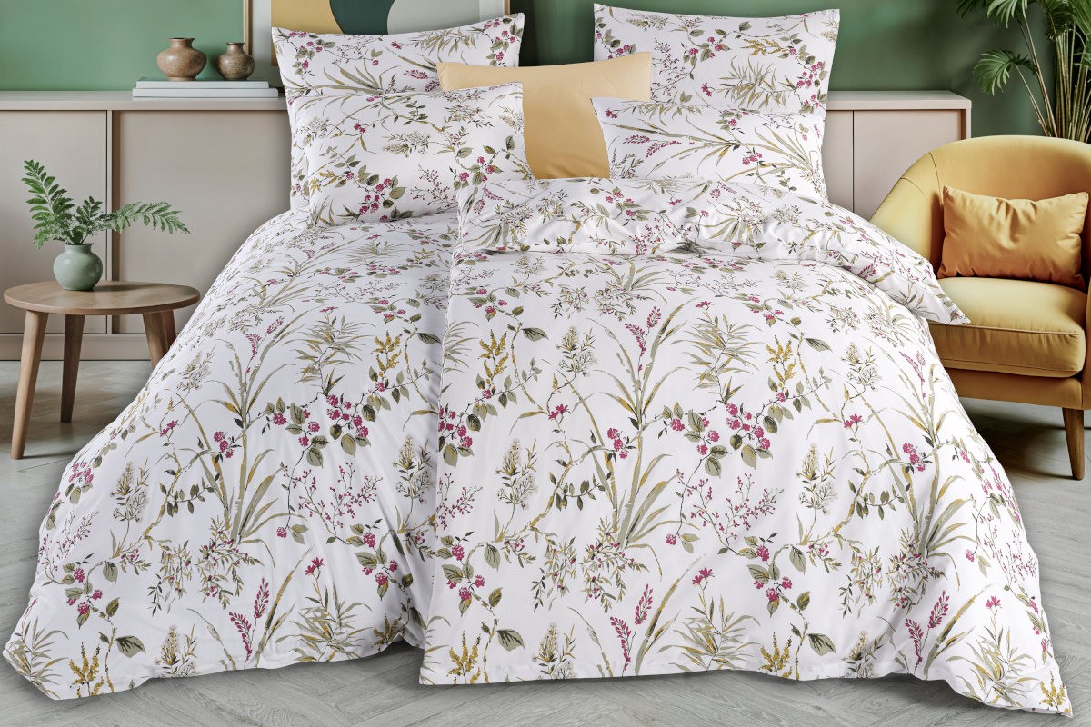 Pościel Marianna została wykonana z wysokiej jakości bawełny o delikatnych, miękkich włóknach, przyjemnych w dotyku. Uroczy roślinny wzór na białym tle doskonale wpasuje się w każdą sypialnię. Materiał świetnie odprowadza wilgoć, praktycznie się nie gniecie i na długo zachowuje swój kształt oraz kolor. Gdy tylko ją założysz nie będziesz chciał/a wychodzić z łóżka. Miękkość bawełny dosłownie Cię otuli, zapewniając idealny odpoczynek.