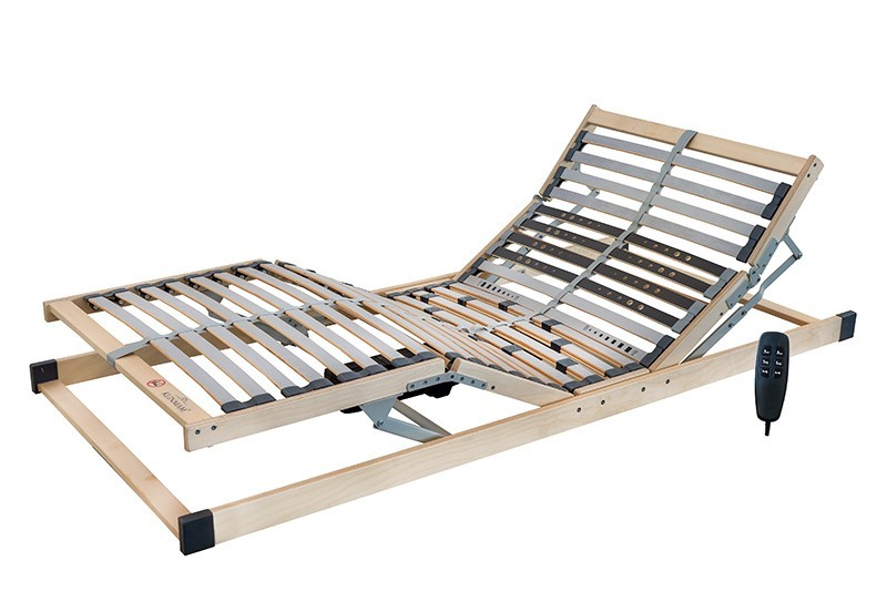 Elektrycznie sterowany stelaż można regulować w zależności od potrzeb za pomocą silnika z dwoma niezależnymi jednostkami napędowymi znajdującymi się w jego górnej i dolnej części. Stelaż można pozycjonować zarówno w obszarze głowy, jak i nóg, w zależności od potrzeb. To sprawia, że jest to doskonały wybór dla wygodnego i zdrowego snu. Elastyczne lamele są umieszczone parami w gumowych uchwytach i są rozmieszczone w 5 anatomicznych strefach. W obszarze ramion znajdują się nawiercone listwy, które zapewniają mniejszą sztywność lameli, zmniejszając w ten sposób nacisk wywierany na ramiona. Taśma środkowa poprawia stabilność i zwiększa nośność stelaża. Przesuwne wzmocnienia umożliwiają indywidualną regulację twardości stelaża w odcinku lędźwiowym.