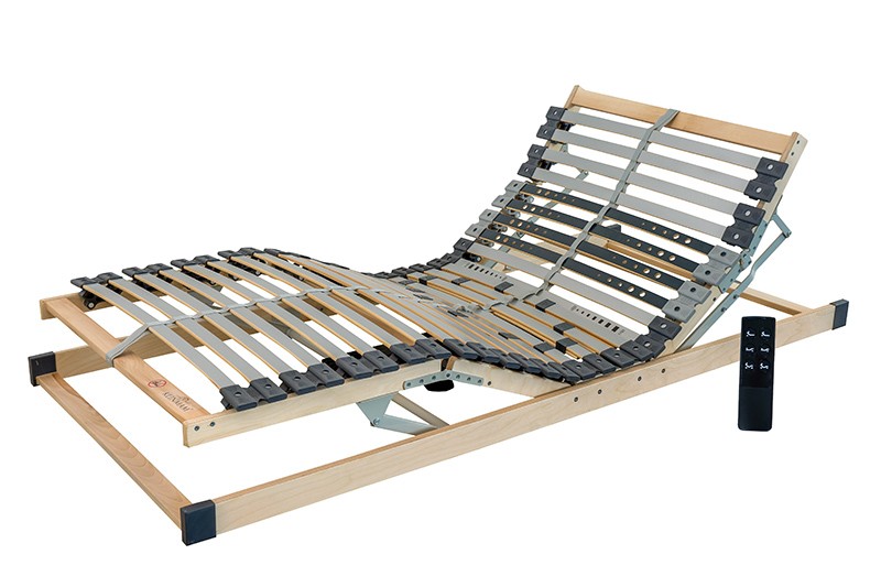 Stelaż silnikowi z uchwytami umieszczonymi nad krawędzią boczną można łatwo odchylić w górnej i dolnej części stelaża za pomocą bezprzewodowego pilota. Gumowe ruchome uchwyty zapewniają zwiększoną nośność i odporność na nagłe, gwałtowne obciążenia. Elastyczne lamele podzielone na 7 anatomicznych są ruchome i reagują na ruchy ciała podczas snu, dzięki czemu każda część ciała jest indywidualnie podparta. Zmiękczone lamele w obszarze ramion sprawiają, że materac nadaje się do spania na boku. Przesuwne wzmocnienia umożliwiają indywidualną regulację twardości stelaża w odcinku lędźwiowym. Pokryte folią lamele zapobiegają przenikaniu wilgoci do materaca, chronią pokrowiec materaca przed uszkodzeniem, a to wszystko sprawia, że stelaże są odpowiednie dla alergików. Aby jednocześnie zwiększyć wytrzymałość i nośność stelaża, produkt wyposażono w taśmę środkową, która poprawia jego stabilność. Stelaż Klinmam Elite Motor Wireless Standard wyposażony jest w bezprzewodowy pilot z funkcją MEMORY (funkcja ta zapamiętuje ulubione położenie stelaża) i funkcją FLAT, która po prostu pozwala na złożenie stelaża do jego pierwotnego kształtu.