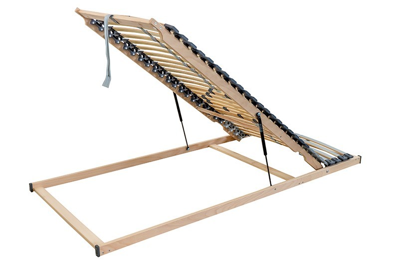 Bardzo wytrzymały stelaż Klinmam Elite P z uchwytami umieszczonymi nad krawędzią boczną zapewnia nie tylko wysoki poziom komfortu, ale także podparcie w czasie snu. Stelaż można podnosić za pomocą teleskopowych podnośników od strony nóg, co zapewnia łatwy dostęp do całego schowka. Specjalne gumowe ruchome uchwyty zapewniają zwiększoną nośność i odporność na nagłe, gwałtowne obciążenia, które mogłyby uszkodzić stelaż. Elastyczne lamele podzielone na 7 anatomicznych są ruchome i reagują na ruchy ciała podczas snu, dzięki czemu każda część ciała jest indywidualnie podparta. Zmiękczone lamele w obszarze ramion podpierają kręgosłup, jednocześnie sprawiają, że materac nadaje się do spania na boku. Taśma środkowa poprawia stabilność, a także zwiększa nośność stelaża. Przesuwne wzmocnienia umożliwiają indywidualną regulację twardości stelaża w odcinku lędźwiowym. Pokryte folią lamele zapobiegają przenikaniu wilgoci do materaca, a to wszystko sprawia, że stelaże są odpowiednie dla alergików. Ponadto, nie musisz martwić się o uszkodzenie pokrowca materaca, który jest w bezpośrednim kontakcie z materacem.