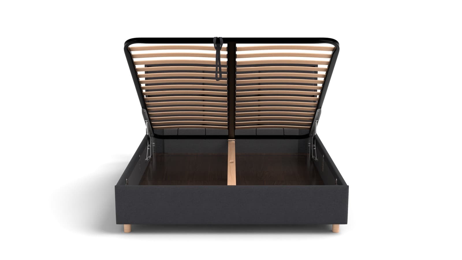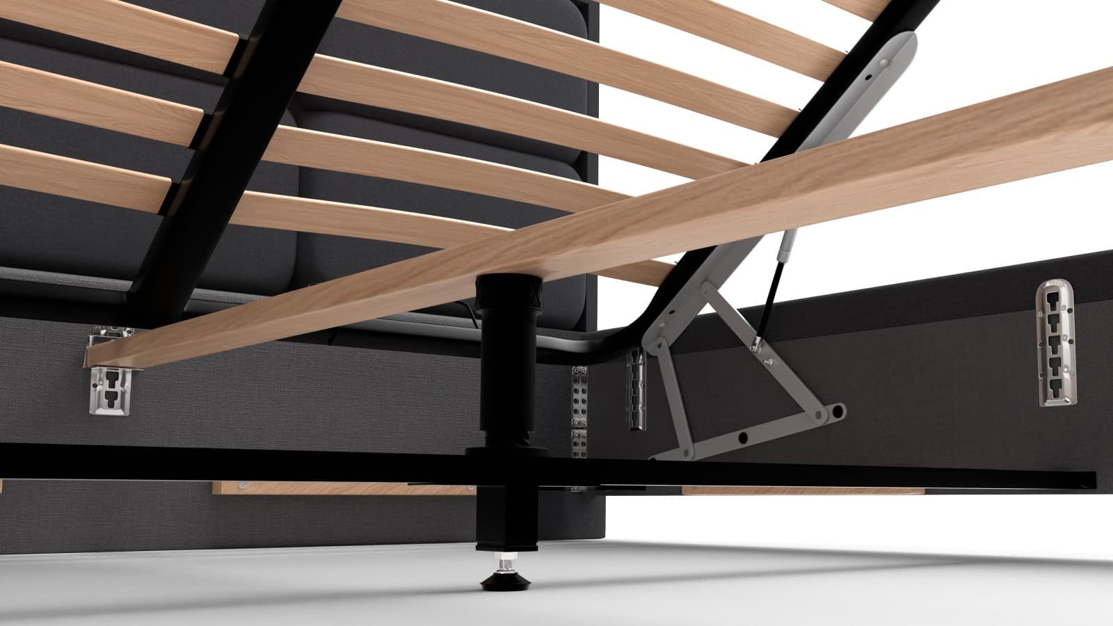 Podstawa ramy FRAME STORAGE zawiera schowek, w którym można przechowywać wszystko, co potrzebujesz mieć pod ręką. Wykonana jest z wysokiej jakości płyt MDF, które są bardzo wytrzymałe, a dla zwiększenia nośności i stabilności w podstawie umieszczono specjalne metalowe wzmocnienia. Ten typ podstawy nie zawiera stelaża łóżka, dzięki czemu jest odpowiedni dla klientów, którzy preferują na przykład stelaże regulowane.