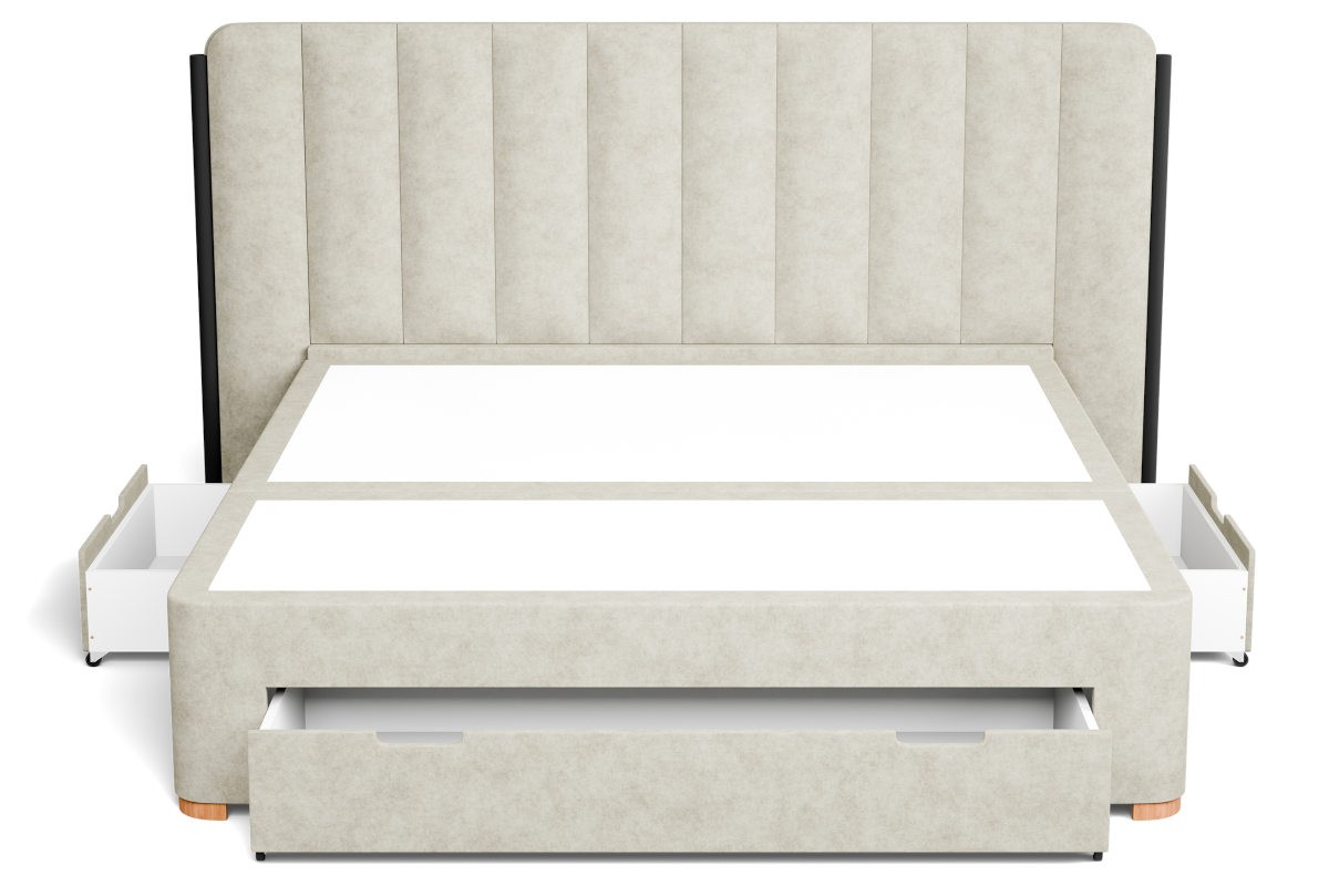 Podstawę BOX DRAWERS tworzy wysokiej jakości rdzeń sprężynowy. Dzięki niemu materac, który na niej leży może oddychać. Sprężyny odpowiadają za odprowadzanie nadmiaru wilgoci, co zmniejsza ryzyko wystąpienia pleśni i mikroorganizmów w łóżku. Pod rdzeniem sprężynowym znajduje się przestrzeń do przechowywania w postaci szuflad. To praktyczne rozwiązanie nie wpływa negatywnie na design łóżka boxspringowego, a całość jest do siebie dopasowana.