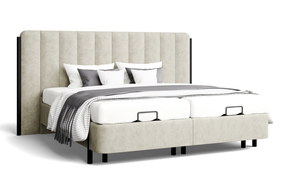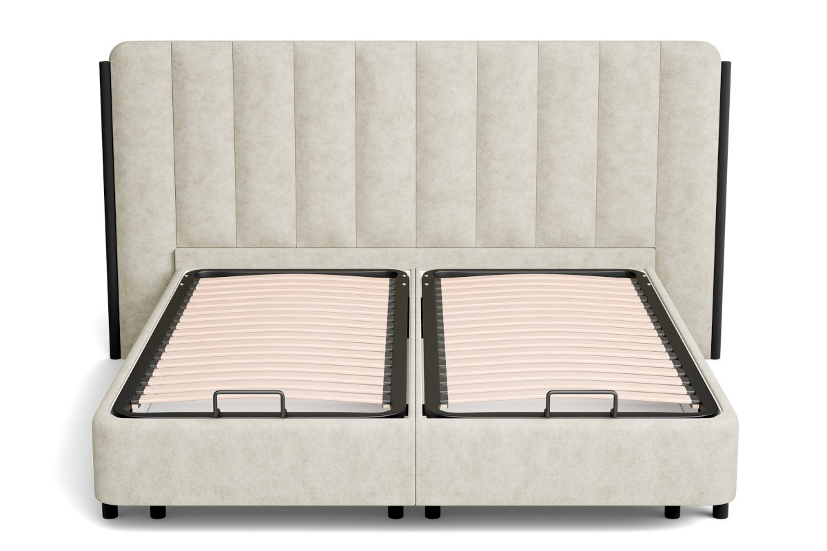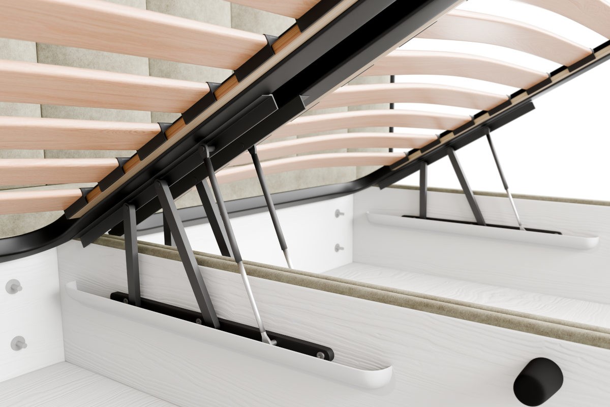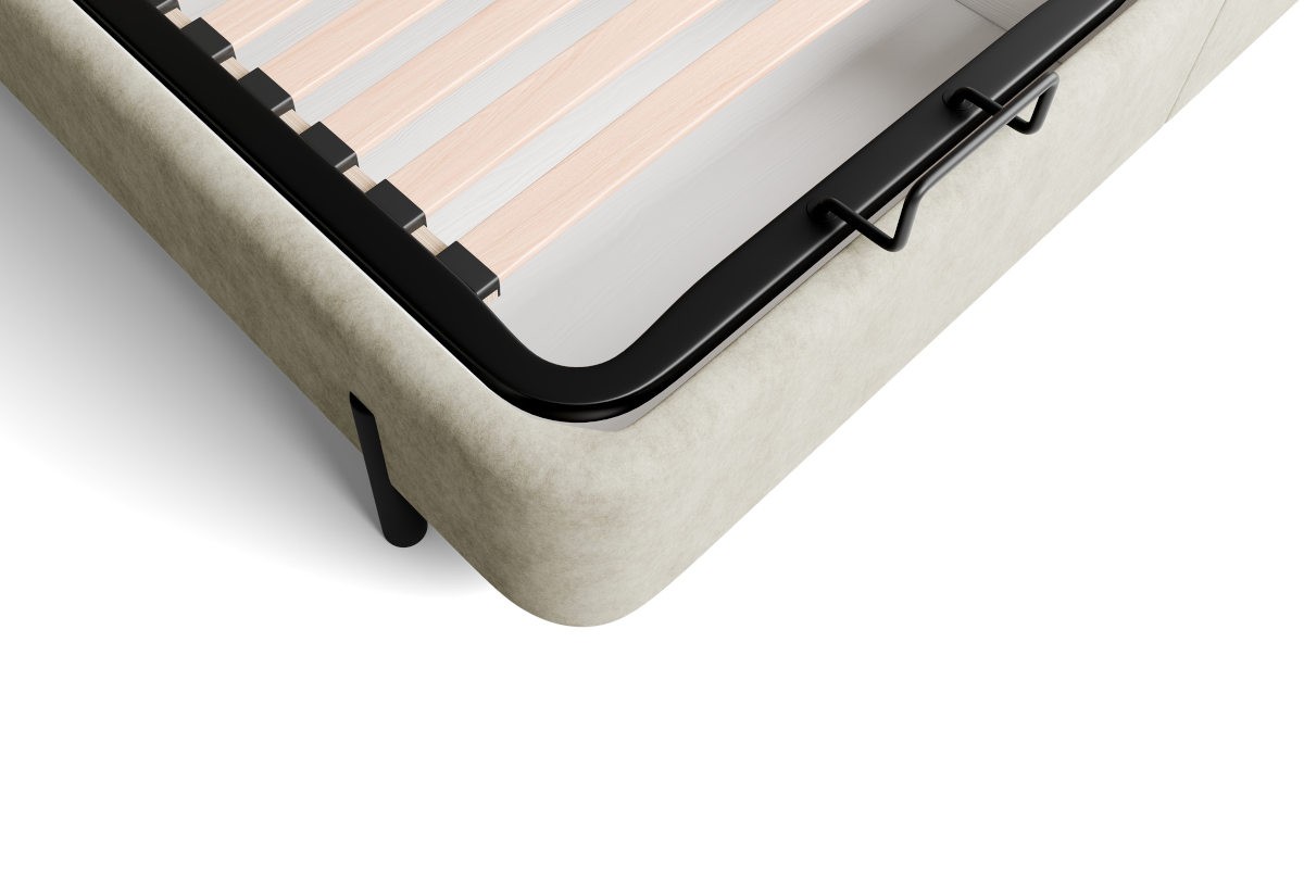 Podstawa BOX SIDE LIFT składa się z dwóch oddzielnie podnoszonych powierzchni do spania. W ich rdzeniu znajdują się sprężyny, dzięki którym całe łóżko, pomimo przestrzeni do przechowywania, jest doskonale przewiewne. Przewiewność odgrywa dużą rolę w odprowadzaniu wilgoci z łóżka, zapobiegając pojawianiu się pleśni i mikroorganizmów. Przestrzeń do przechowywania jest podzielona na dwie części tak, jak podzielone są podstawy. Powierzchnię do spania można podnieść z boku w kierunku środka łóżka.