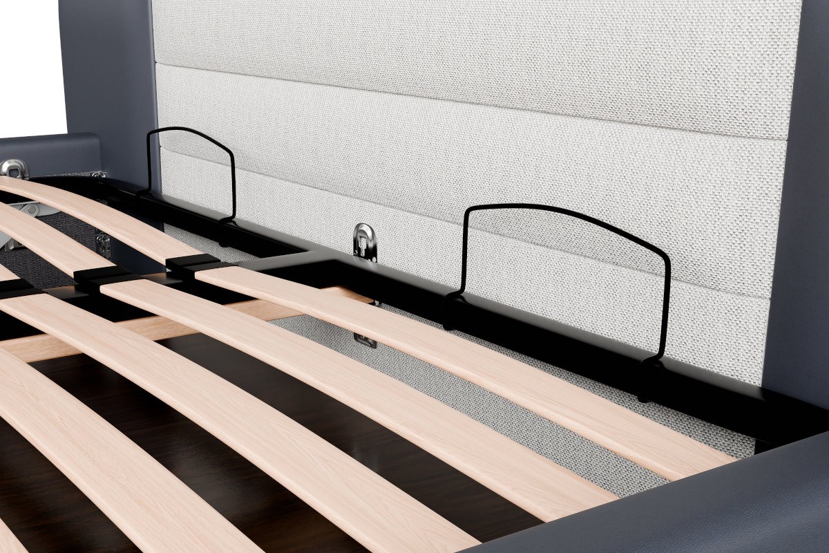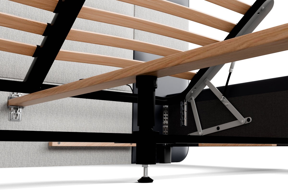 Podstawa ramy FRAME STORAGE zawiera schowek, w którym można przechowywać wszystko, co potrzebujesz mieć pod ręką. Wykonana jest z wysokiej jakości płyt MDF, które są bardzo wytrzymałe, a dla zwiększenia nośności i stabilności w podstawie umieszczono specjalne metalowe wzmocnienia. Ten typ podstawy nie zawiera stelaża łóżka, dzięki czemu jest odpowiedni dla klientów, którzy preferują na przykład stelaże regulowane.