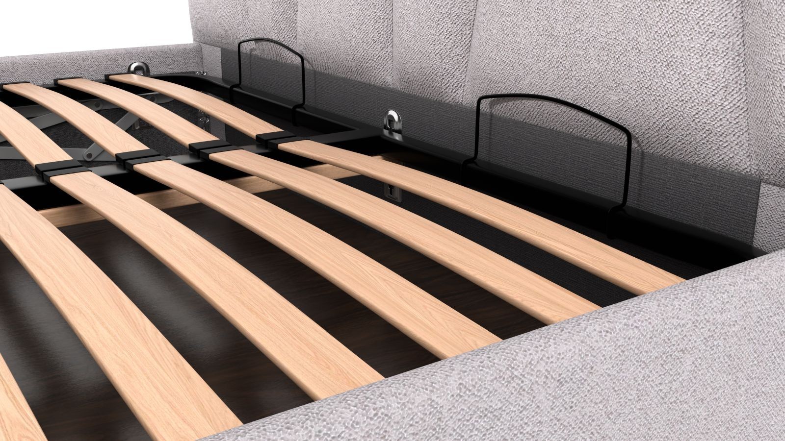 Podstawa ramy FRAME STORAGE zawiera schowek, w którym można przechowywać wszystko, co potrzebujesz mieć pod ręką. Wykonana jest z wysokiej jakości płyt MDF, które są bardzo wytrzymałe, a dla zwiększenia nośności i stabilności w podstawie umieszczono specjalne metalowe wzmocnienia. Ten typ podstawy nie zawiera stelaża łóżka, dzięki czemu jest odpowiedni dla klientów, którzy preferują na przykład stelaże regulowane.