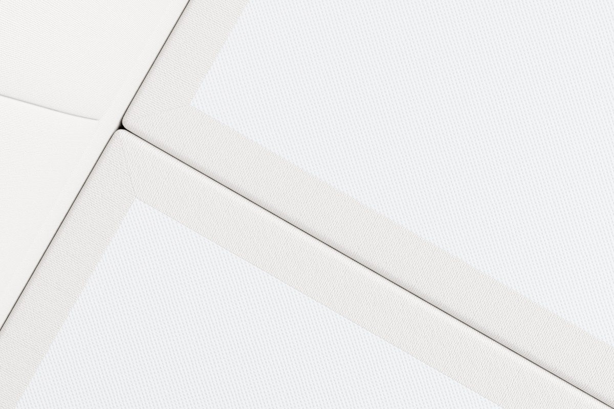 Wezgłowie łóżka Plaza od razu przykuwa wzrok. Główna część składa się z jasnej tkaniny z regularnym pikowaniem, dzielącym wezgłowie na prostokąty o różnych rozmiarach. Spójność geometrycznych linii przełamuje na górze zaokrąglony, ciemniejszy pas. Kontrast kolorów i kształtów nadaje wezgłowiu oryginalny i pomysłowy charakter.